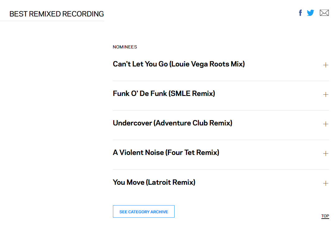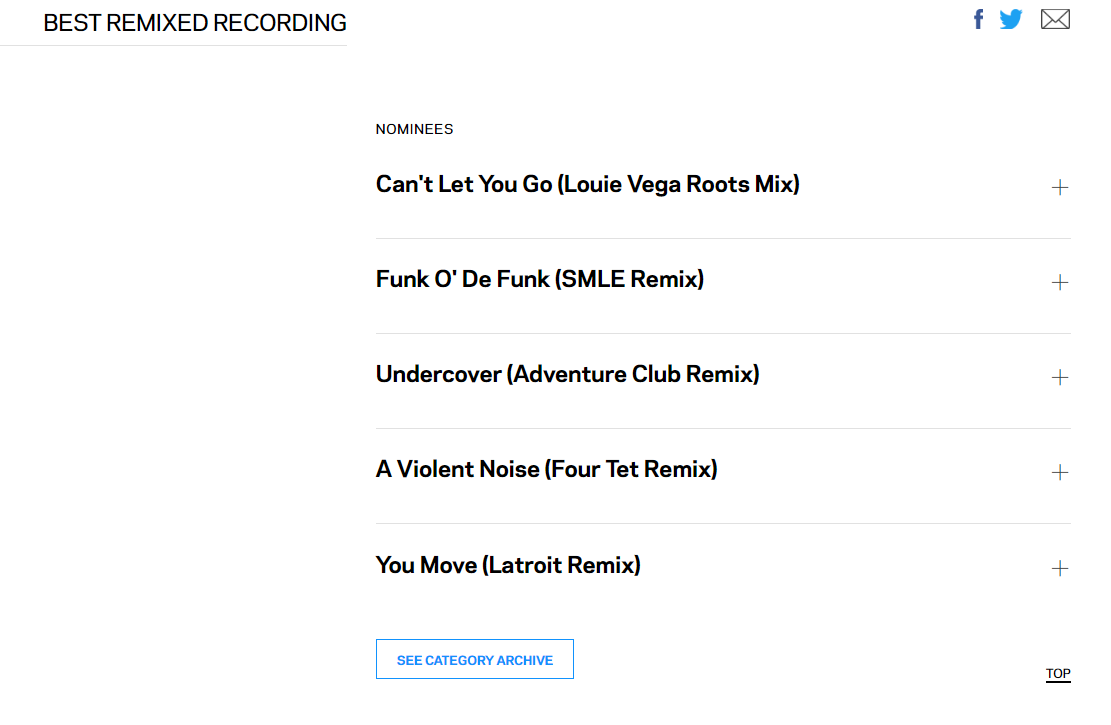 以及刚才罗列到的提名中,最佳Remix唱片。五首音乐中会不会刚好有你的挚爱呢?