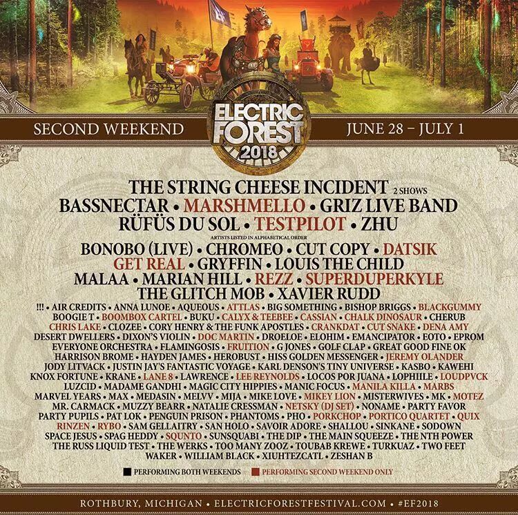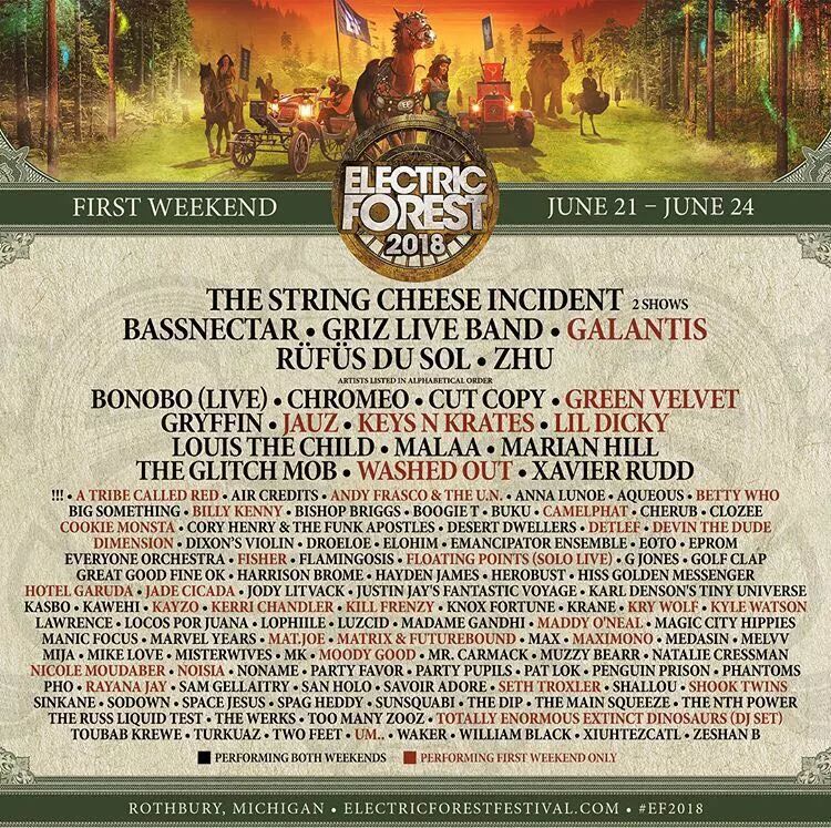 2018年的Electric Forest仍然定于六月底举行,分为两周的两个时段:6月21日-24日,6月28日-7月1日。场地不变。再来看看阵容: