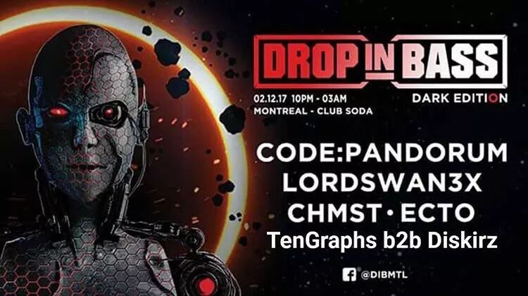 Code:Pandorum/Lordswan3x/Chmst/Ecto/TenGraphs b2b Diskriz。主打Deathstep 和Riddim Dubstep,不折不扣的Dark Party,此次活动也被主办方Drop In Bass命名为“Dark Edition”。