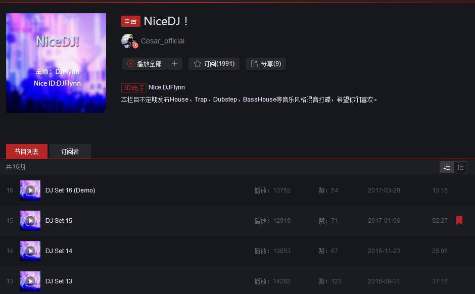 截止到2017年今天,Cesar的电台“NICE DJ!”已经吸引1991人订阅。更重要的是,目前为止Cesar的每一期Continuous Mix都获得了可观的播放量。加上音乐制作人的身份以及播放量高达51万的歌单,Cesar目前在网易云音乐积累了4500位粉丝。