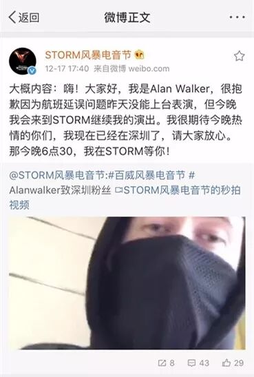 好在Alan Walker后来也在各大社交网络发布了声明,道歉,说是自身原因误机,导致错过了演出。并且在风暴电音节深圳站的Day 2补回了演出。让整件事的性质从“放鸽子”变成了“迟到”。最起码Alan Walker还把欠粉丝们的60分钟补上了。可谁又能补上主办方的品牌负面影响呢?