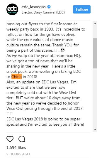 2016年10月份,我们就告诉你EDC会在2018年进入中国。即使现在爱造谣的公众号越来越多,但幸好我们的说法还是得到了证实。虽然途中试图取得中国区代理权的主办方发生了变更。今日,EDC官方正式宣布,2018年EDC将会新增中国站。等待官宣的朋友们,心里终于不再半信半疑了吧。