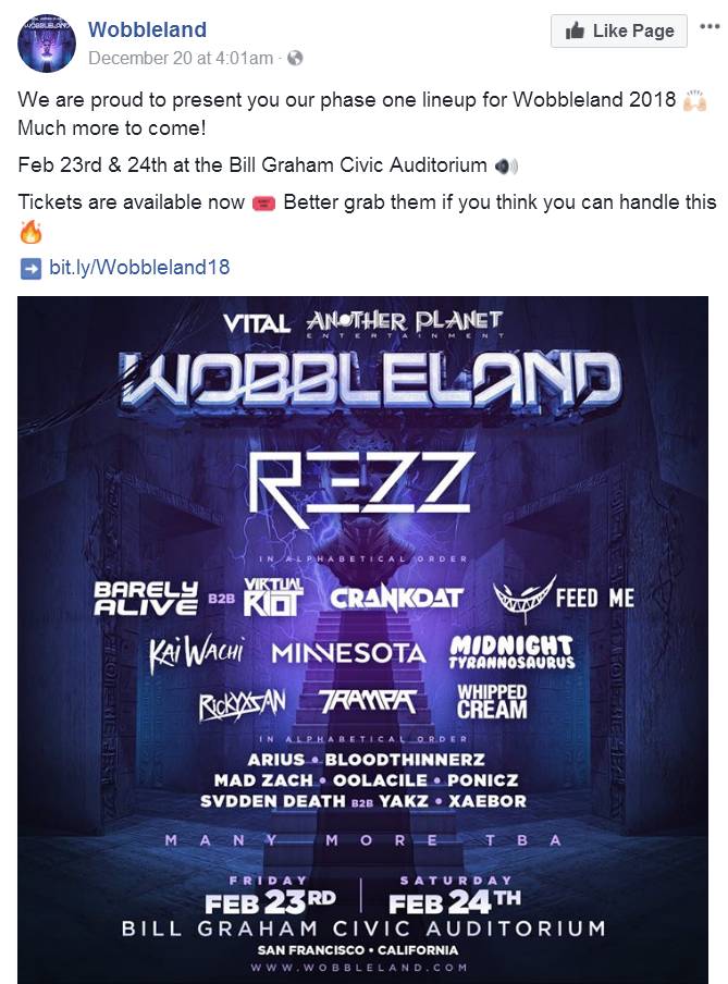 即将到来的2018年自然也少不了Wobbleland的“壮阔身影”:2018年2月23 – 24日,Wobbleland将用强大阵容的Bassline席卷旧金山的Bill Graham市政礼堂,由Vital Events与Another Planet合作举办。可以说Wobbleland 2018刚刚宣布第一阶段阵容就惊艳了我们,一起来看看冰山一角的Line-up。