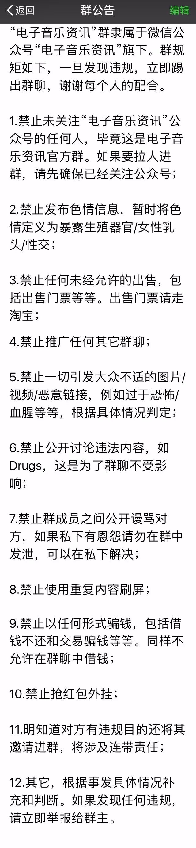 但是,电子音乐资讯官方群有着明确的群规。如果你无法遵守群规,那么干脆就不要添加我们的官方账号,避免不必要的麻烦。为了防止读者进群之后无法遵守群规或者干脆无视群规,我们决定在文内贴出群规。如果你认为自己可以做到中规中矩,那么再考虑添加我们的官方微信,成为群聊一员。