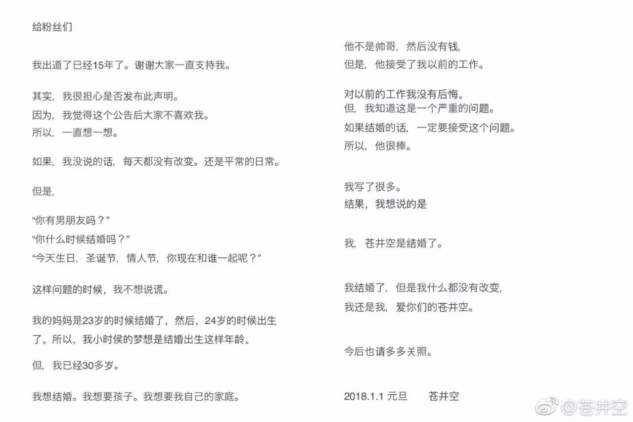在微博上,苍井空也用中文告诉了中国粉丝们这一切。尽管他并没有提到丈夫的名字,但毕竟国内外媒体都已经传开。当然,苍井空的丈夫DJ Non并不是一位知名度很高的DJ,但在他的社交网络上绝大部分都是演出海报,在本地还是有一定声望的。