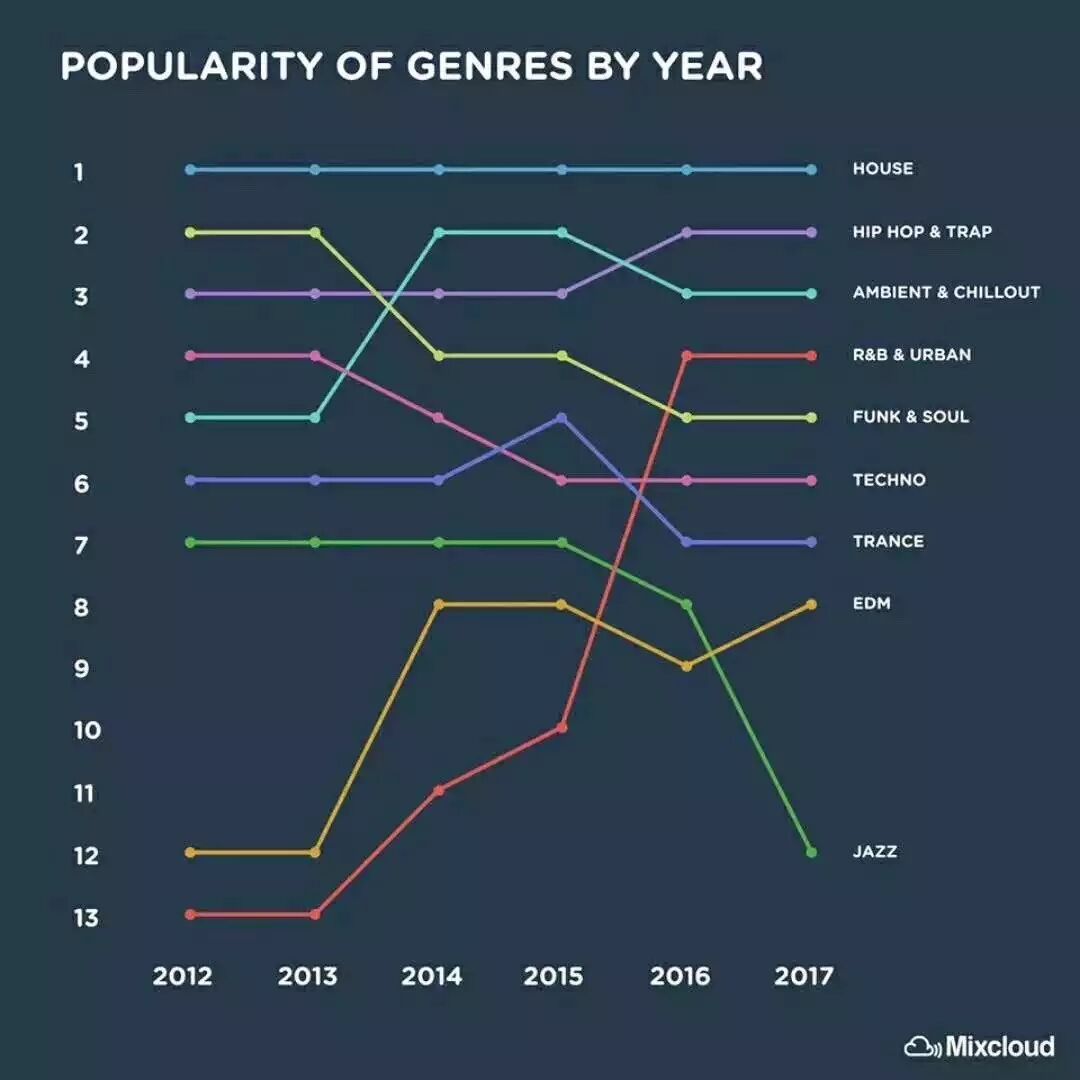 Mixcloud是在2008年起源于英国的流媒体,该流媒体主要为DJ/音乐制作人服务。无论是资源亦或者是定位,都以电子音乐为主,也与DJ们热播的音乐风格变化息息相关。前段时间,Mixcloud总结出了2012年到2017年,13种音乐风格大类的趋势,可供参考。