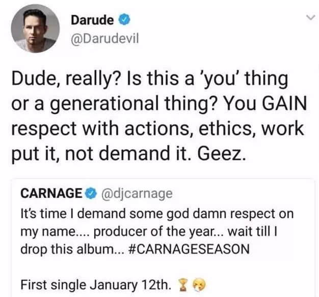 该条推特动态一经发出,就遭到无数网友的嘲笑与唏嘘,不禁让人想起不久之前Carnage空摆架势打脸的808教程视频,以及与挑衅“终结者”Deadmau5的撕逼闹剧。知名制作人/DJ——Darude也发声,指责Carnage过分自负。