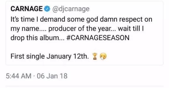 美国籍DJ/制作人Carnage最近忙着宣传自己的未发行专辑,在各大社交App上预告着专辑新单的发行日期。这对于艺人们来说是见怪不怪的家常便饭,粉丝们也好满心期待地关注着艺人动态。
