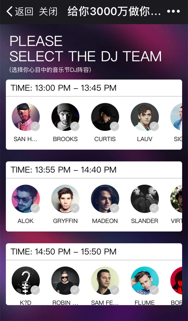 据不同的时间段,你可以选择你心仪的音乐制作人/DJ。毋庸置疑,这是一些极具知名度的电子音乐艺人,估计总有你的菜。3000万人民币的预算,你可要好好把握了。完成之后进入下一页,并且确认信息是正确的。