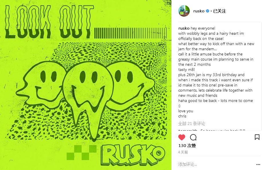 在自己33岁生日之际,也就是1月26日,Rusko带着自己久违的Dubstep新单《Look Out!》以及回归舞台的演出信息给了所有Ravers一个超大的惊喜,并且重新注册了新的Instagram账号,预示一切将重新开始。舞台!创作!双重回归!