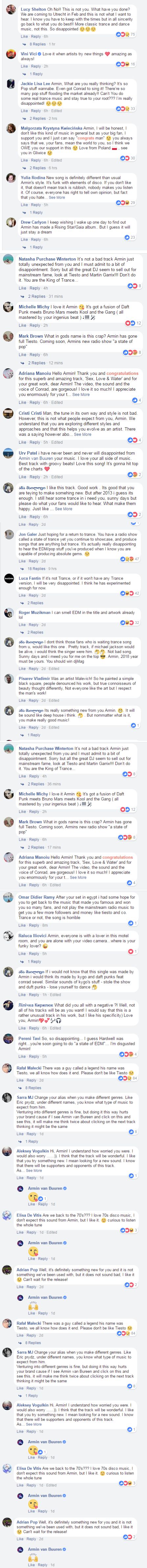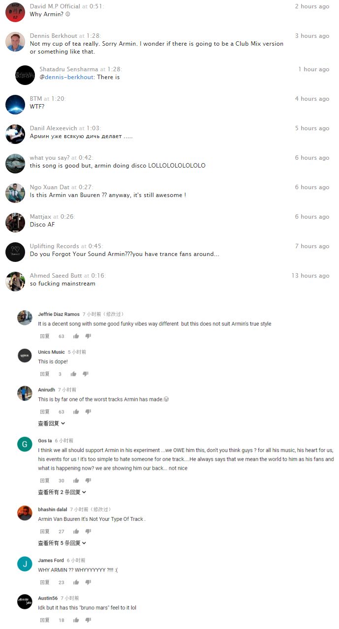 由于内容太多,我们不想进行一一翻译。但大致的意思,总结起来就是大家都表示“阿明你怎么了?”,“你怎么开始做这种东西了?”,“你可是Trance之王啊,你应该做Trance才对”,“你不应该像Tiesto那个家伙一样放弃Trance跑去做EDM”。