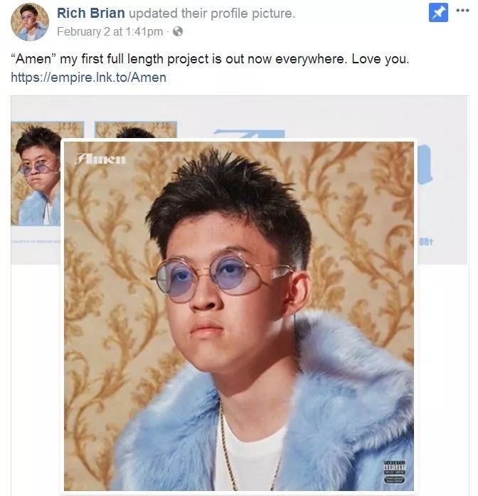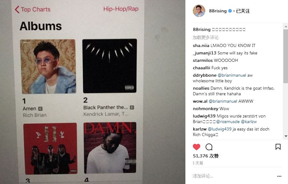 而更名后的Rich Brian的最新专辑《Amen》近日就在iTunes Top Charts的Hip-Hop/Rap专辑排行榜中斩获了第一名,他也发布了动态为此庆祝/纪念。虽然iTunes的榜单根据日总下载量排名每天都会变动更新,但作为黄种人的Rich Brian能拿下Hip-Hop/Rap专辑排行第一名值得我们为他喝彩和骄傲。