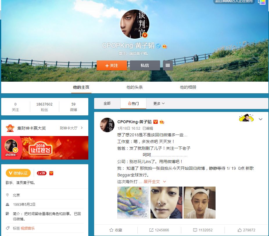 虽然早在几年前,黄子韬就已经在他的歌词里提到过“我正在带领C-Pop”,并且多次在社交网络和宣传的通稿文案里强调自己是C-Pop的领头羊和代表人物,但那个时候,他还没有把微博名字改得这么令人无语。好吧,或许这已经不是新闻了。