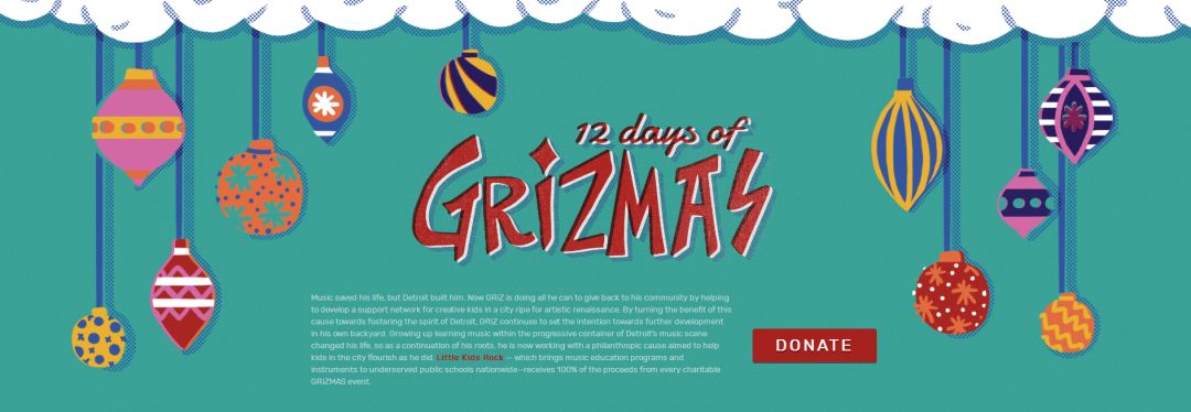 而Griz更让粉丝们欣赏的是他发行的所有歌曲都可以免费下载,除此之外还有他为慈善事业所贡献的个人力量“12 Days of Grizmas”公益网站。他表示只想用自己的力量回馈社会,帮助无助的孩子们圆梦。