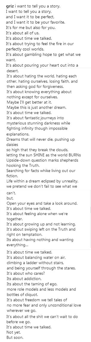 年轻的Griz热爱音乐,热爱文学,你们可知道文笔卓越的他还是位优秀的诗人?2月1日,Griz在Instagram账号上清空了所有的动态后发布了一张白纸的照片,寓意抹掉一切重新开始。昨天,他发布了第二条动态,内容为他着笔的一首小诗,也有可能是新歌歌词。