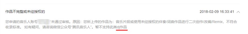 就在昨天,有一位电子音乐制作人尝试申请腾讯音乐人,这位电子音乐制作人在国内已经小有名气。但是腾讯音乐人驳回了他的申请,原因是“这是未经授权的改编”,但其实这是原创。最后更是提到“暂不支持DJ作品”。我们有点儿看不懂了,什么叫“DJ作品”?