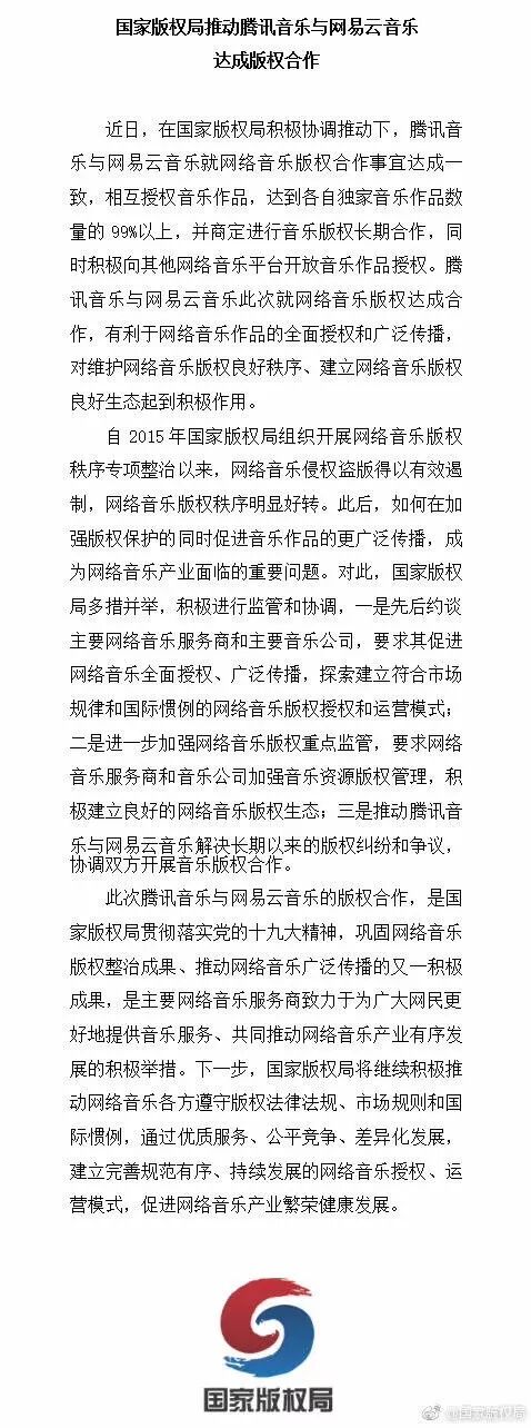 就在昨天,国家版权局的所有官方账号,一齐推出了一则重大消息。在国家版权局的强烈推动,甚至可以说强制推动下,腾讯音乐与网易云音乐达成版权置换的合作。在接下来的日子里,99%以上的独家音乐作品将会被共享,具体事宜见图。
