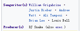 DJ Snake的《Let Me Love You》可以说是大家都听过的热单,所以我们拿它来做例子。这首单曲里,DJ Snake是它的制作人,也就意味着DJ Snake负责的是整首音乐的编曲。但这首单曲的Songwriter则不止DJ Snake一个人。