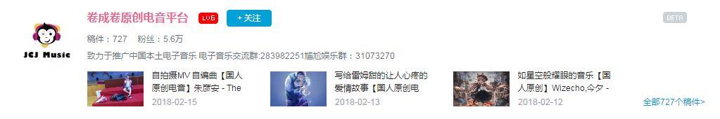 卷成卷的粉丝主要位于B站,也就是Bilibili,当然这也是它成名的根源。目前为止,卷成卷原创电音平台已经在B站拥有5万多粉丝,在网易云音乐、今日头条、第一弹分别都拥有2万多粉丝,微博则刚刚启动。整体粉丝布局对于国产电音来说可以说是比较可观的。