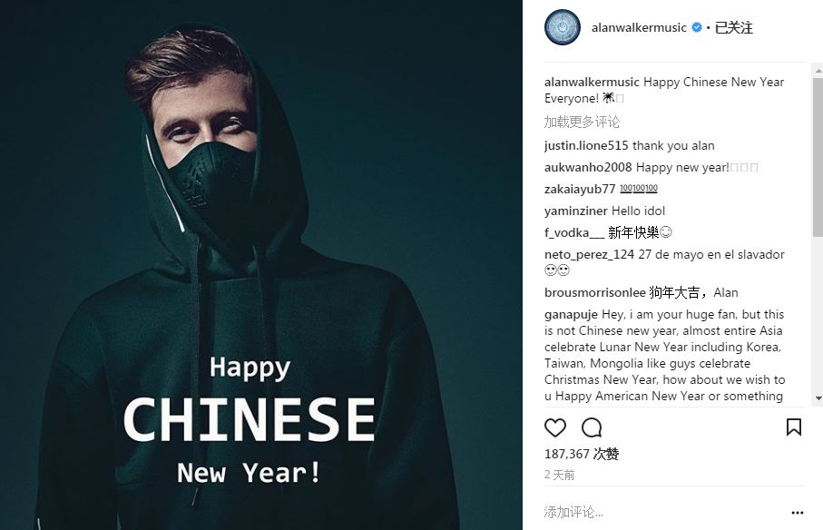 Alan Walker也是个机智的商业达人,他非常清楚,自己的粉丝里中国人占比有多高。一首《Faded》在国内的影响力,早就已经远远超出了电音爱好者的受众范围,是C-Pop爱好者最爱的他们所谓的“外国音乐”之一。所以,他也向中国的粉丝们送上了新年祝福。