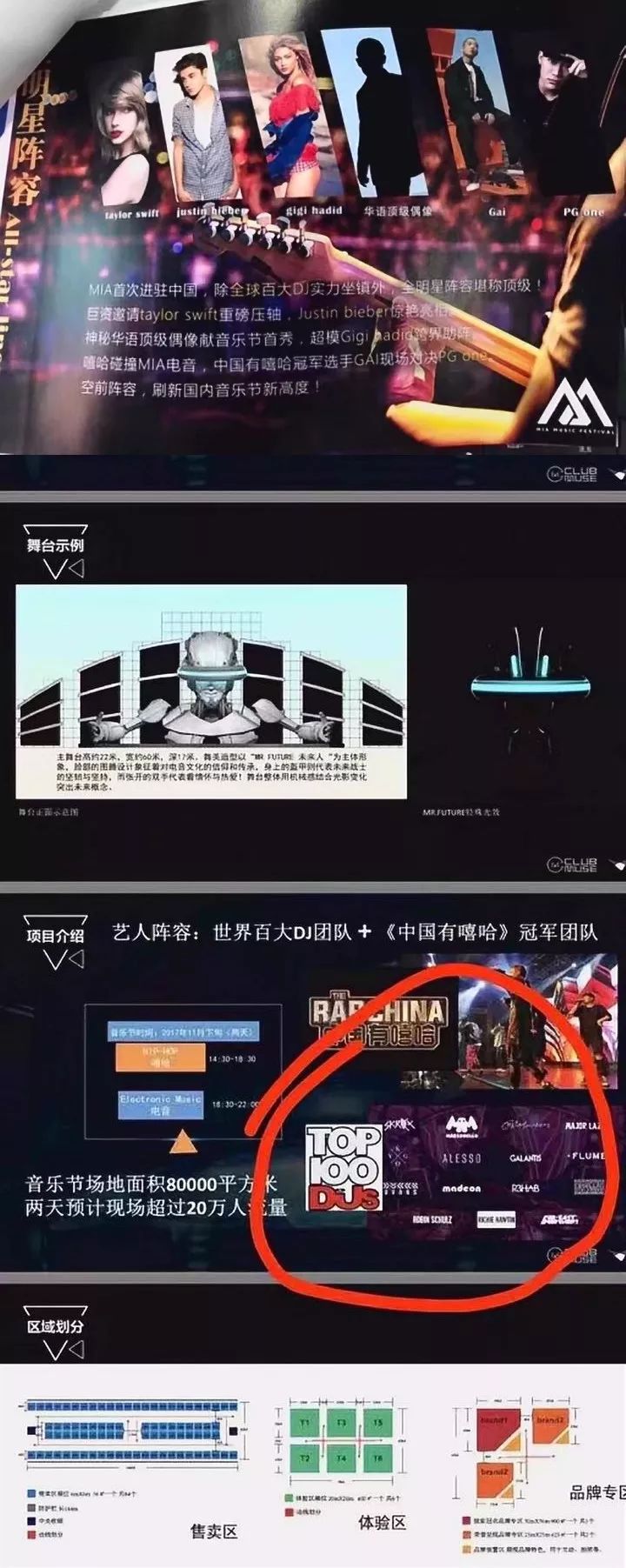 严格来说,我们只是把音乐节作为一个例子,因为一场音乐节的举办,各个环节的成本加起来,几百万是很正常的。但在我们接触的活动中,其实仓库派对也有招商的环节,所以也会有这类招商PPT,也会有拟邀阵容,只不过在于它是否可能外流。