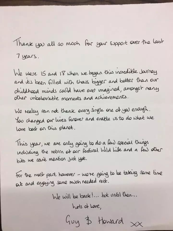 就在当时,我们也对这件事进行了报道,引发了不小的反响。但后来Disclosure又在各大社交网络上说道,他们可能并不会完全离开舞台,在接下来的一年内,他们将只会在自己举办的音乐节WILD LIFE FESTIVAL上演出。而他们确实也做到了。