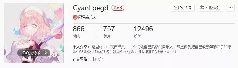 Cyan Lpegd是来自新疆的00后音乐制作人,目前还未进入全职阶段。身为学生的他,年纪虽小,但有不少思想,他充分将对音乐的挚爱投入到创作当中。Kawaii Future Bass是他的音乐风格定位。目前为止拥有多首评论量数千的热单。