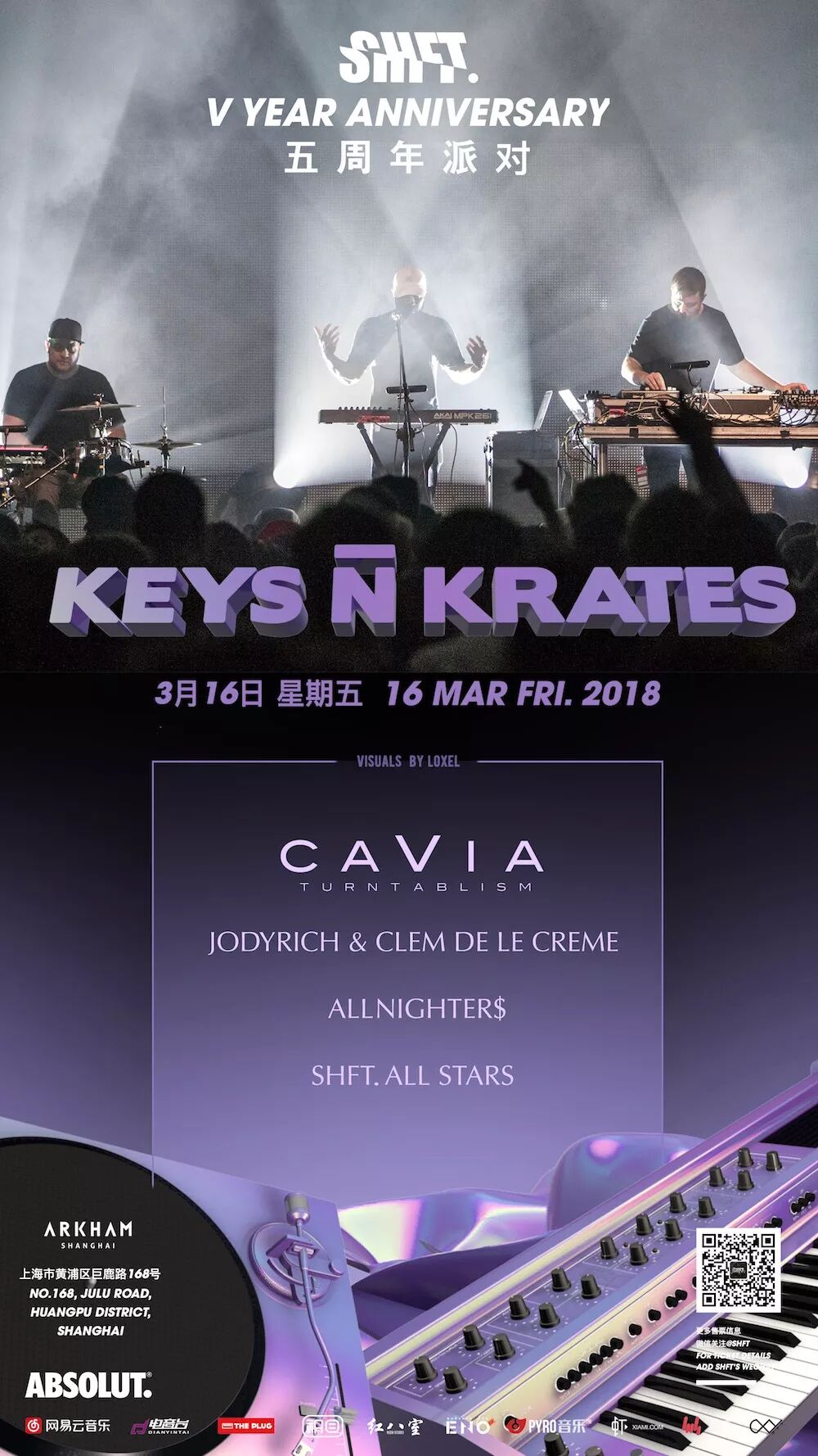 一开始,Keys N Krates的音乐风格定位是Hip-Hop。有趣的是,三个人都是音乐制作人,并且三个人都会出席台前的演出。他们的演出结合了Live Set和DJ Set,总是给大家带来相对先锋的Trap选曲。2008年到现在,他们有不少单曲在大街小巷得到传播。