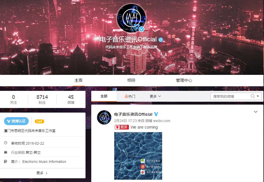 在2018年2月底,电子音乐资讯还开设了官方微博账号,但目前为止仍然处于公测期间。由于在微博平台上,电音爱好者的粉丝精准度并不算特别高,所以这一块也成为了需要多加考虑更明确的定位的潜在用户挖掘平台。敬请期待。
