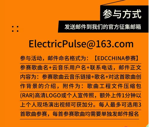 然而为什么我们现在提醒大家抓紧时间报名呢?EDC China的主题曲的海选时间为2月9日~3月12日,也就是说,现在只剩下2天的时间让你投稿。我们应该都听说过一个词叫“过时不候”,所以希望制作人们赶紧在这两天递交作品。认准邮箱“ElectricPulse@163.com”。