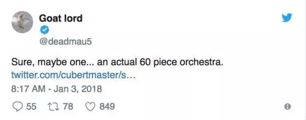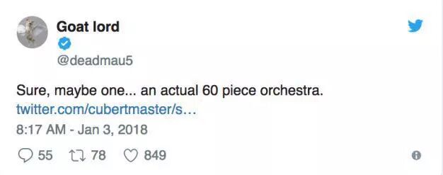 阅读原文几个月以前,deadmau5在推特上声称,自己正在进行他的音乐生涯里最重要的作品。与此同时,在直播平台Twitch上,deadmau5也通过直播的方式告诉了大家什么意思。这是一个雇佣了60人管弦乐队的新尝试,将用管弦乐的方式重新演奏他的音乐。