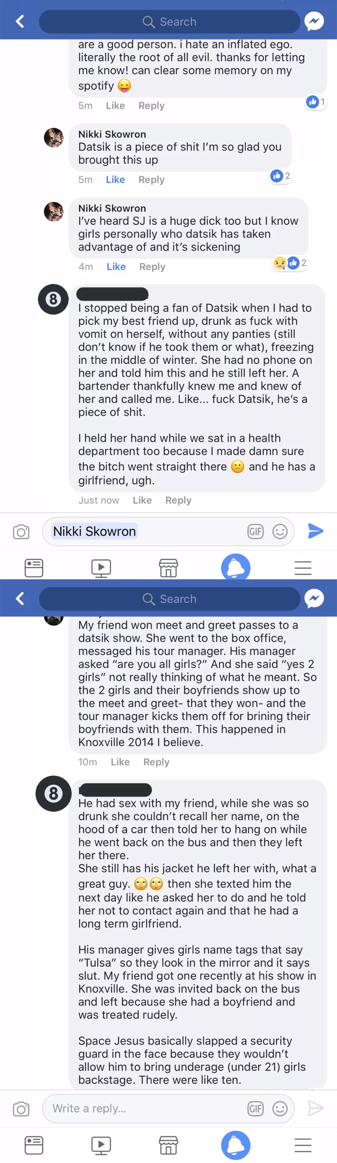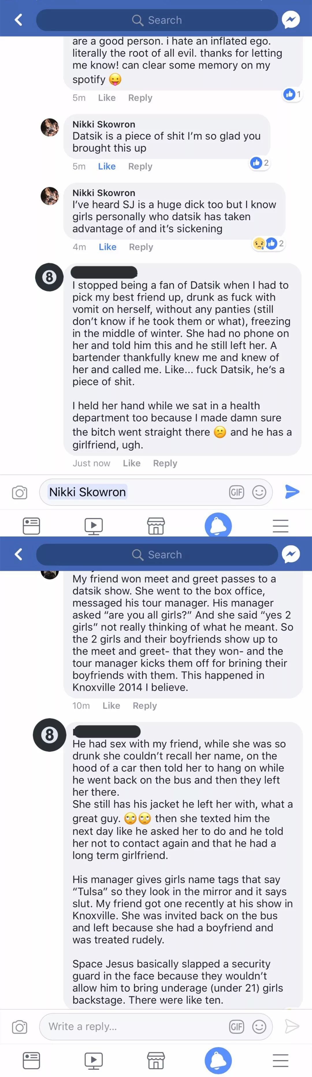 Datsik成为了今天全球社交网络上的首要热点,他的各大社交网络都已经被骂得不成样子,似乎也只剩下极少数粉丝站在他这边。事情的来源是一位推特用户Princesssjay,在推特上放出Facebook聊天记录,指向Datsik与醉酒的粉丝发生了关系,可能是Rape。