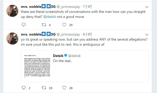 揭发Datsik对粉丝进行Rape的推特用户Princesssjay则很快回应了Datsik。认为Datsik的回应实在太模棱两可,对于这么多指责,他并没有任何有证据的反驳,无法解决任何一项指控。她甚至觉得Datsik只是在逃避问题。
