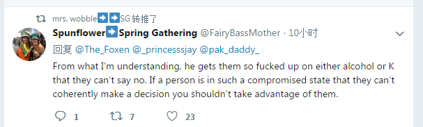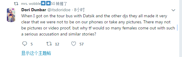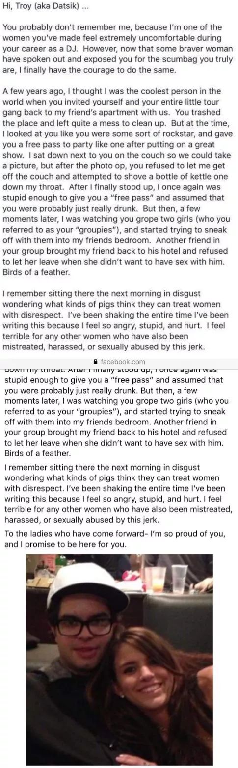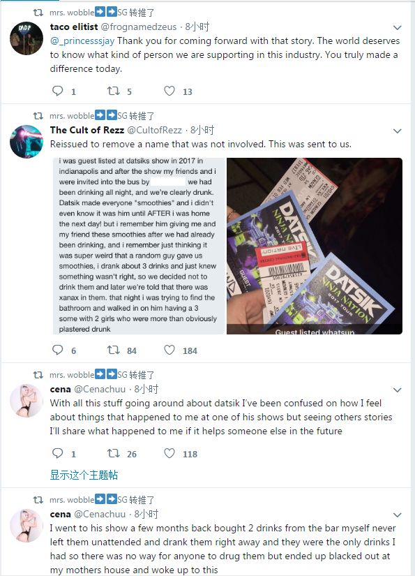 而更多Datsik粉丝都发表了他们的看法。大致的方向是一样的。也有当事人说了一些什么。这些粉丝都已经在酒精之下进入了喝醉的状态。她们基本上已经没有什么意识,也无法做出要不要发生关系的决定,认为Datsik利用了这一点。