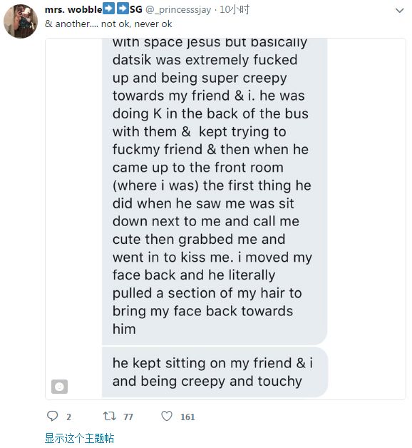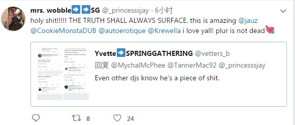 Princesssjay也表示事情没那么简单,还没完呢。与Datsik在巡演中同行的Support DJ也是一位知名艺人Space Jesus还带着了大概十位未成年粉丝进入后台,在被保安拦截之后,甚至对保安以暴力相向。