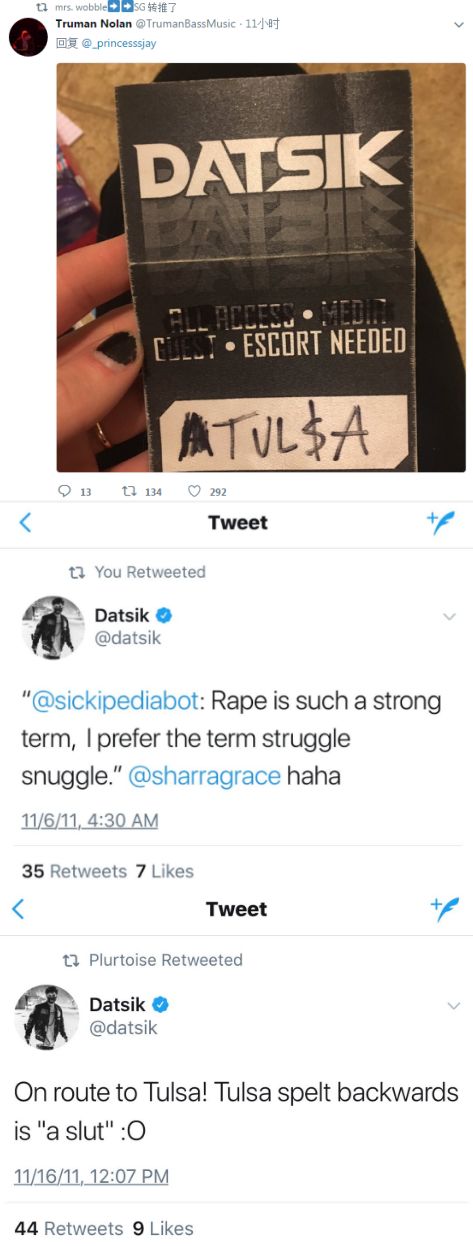 随后,推特用户Princesssjay还转发了有关于Datsik删除的两条几年前他认为“这不是Rape而是挣扎依偎”,甚至亲自解释了“Tulsa”的意思就是“A Slut”,反过来写。这与粉丝在巡演接送巴士上收到的写有Tulsa字样的通行证的图片联系在了一起。