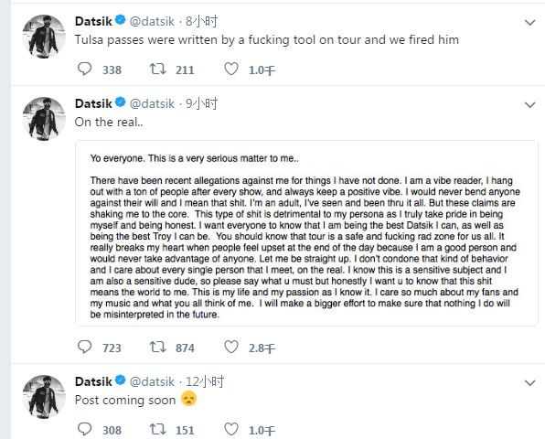 紧接着,Datsik还说,“Tulsa的通行证是一个该死的自大的家伙写的,我们已经解雇了他”。还有知情人士称,写Tulsa的,是Datsik的Tour Manager,也就是巡演经纪人。这应该是唯一一点Datsik可以勉强“甩锅”的方面。