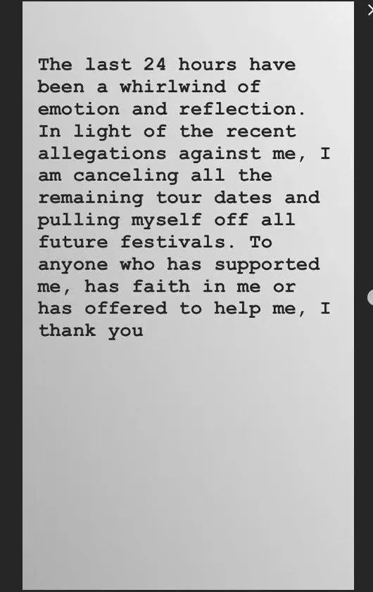 指责Snails和Jauz的事,随着动态的删除也就翻篇了。但是,反观Datsik的事情,真的被弄得鸡犬不宁,惨到了极限。为什么说Datsik惨呢?先来看看他个人的动作。Datsik自称在24小时内面对这些指控十分情绪化,并且取消了接下来的所有演出。