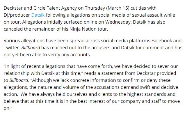 不仅在自己的厂牌被踢下台,Datsik签约的经纪公司Deckstar,Datsik签约的演出预定经纪Circle Talent Agency,也都宣布与Datsik解约!这或许是近段时间你所见识到的艺人最惨的局面了,一夜之间与厂牌、经纪公司、Booking Agency全部告别!