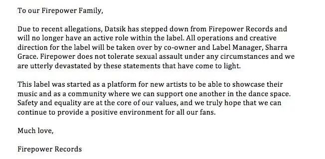 更惨的是,Datsik创立的厂牌Firepower Records,则宣布Datsik已经下台,接下来将由股东和厂牌经纪人负责厂牌的事宜,并且急忙与Datsik分清界限。一位厂牌的创始人,竟然被他花了几年心血带大的厂牌踢了出去,相当于丢了事业。