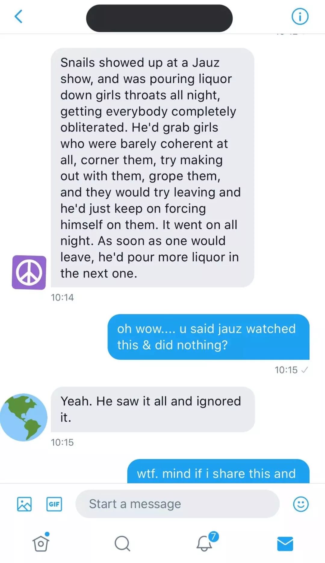 大致的意思是,Snails出现在了Jauz的演出上,并且不停地撩粉,强制搂抱她们,甚至摸她们,并且一整个晚上都在寻找下一个目标。而Jauz就在旁边静静看着,他并没有阻止Snails。Princesssjay还特地艾特了Jauz。但现在她已经把这条动态删除。