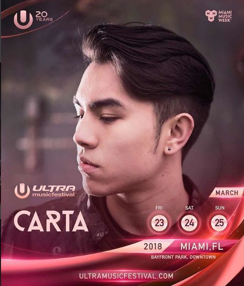 然而就在昨天,Carta宣布自己又取得了一项成绩,他将登上Ultra Miami的舞台演出,并且是在Ultra众多舞台当中知名度最高的舞台之一Worldwide。说白了就是UMF的始发站迈阿密,其中大牌密集的炙热舞台。迈阿密时间3月24日下午1点~2点,即北京时间25日凌晨1点~2点,是他的演出时间。