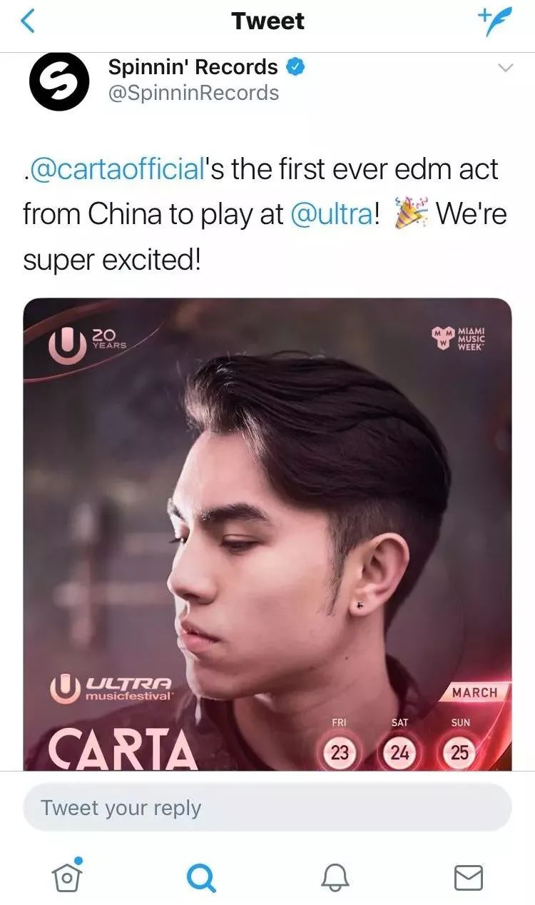 Carta所签约的厂牌Spinnin' Records则在社交网络上宣布,“这是EDM领域有史以来第一位来自中国的艺人在UMF迈阿密站上演出”。
