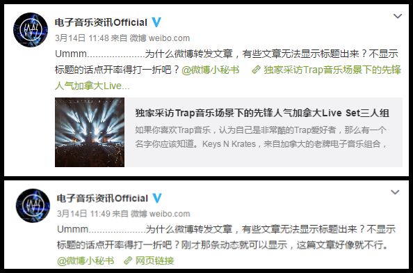 言归正传,在我们运营官方微博的这段时间里,我们发现微博对于“外来知名媒体”很XX不友好啊!原本我们希望节约排版的功夫,以复制链接的形式直接在微博上呈现文章。不过这就像是个Bug,有些时候不会直接显示我们转发的标题和内容,但有时可以。