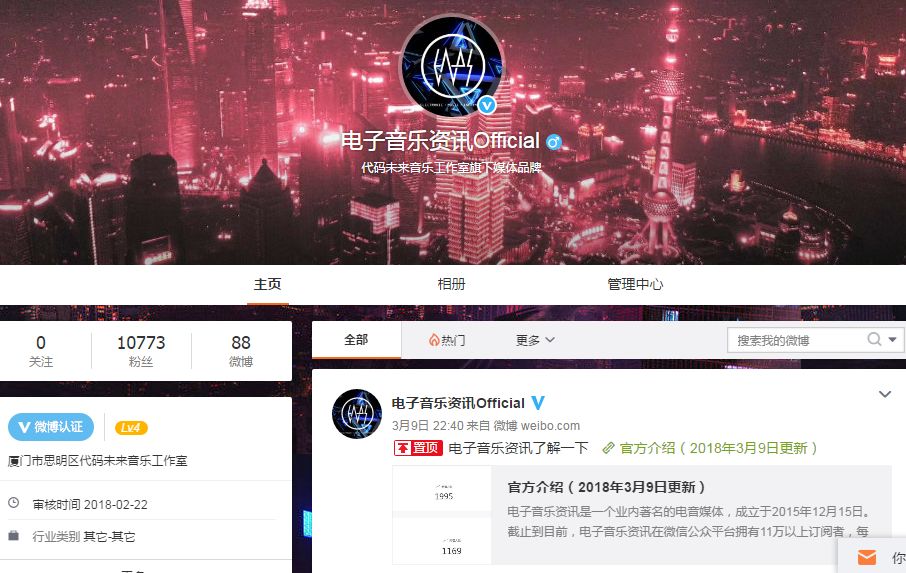 阅读原文明人不说暗话。我们这段时间聊微博聊得这么频繁,就是希望大家到微博上关注一下我们的官方账号。当然也有粉丝知道曾经我们对微博十分不齿,但公是公,私是私,我们还是希望在微博上扩展一下电子音乐文化。对电子音乐对微博对我们都好。