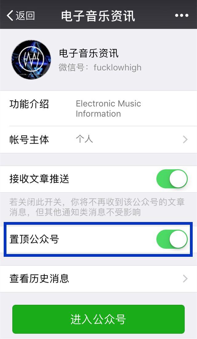 假如你喜欢我们的公众号,或者说你不愿意承认这个事实,但你却从我们这里学到了很多东西并且常常阅读我们的文章,那么请在微信公众平台置顶《电子音乐资讯》。我们觉得这是一个很好的功能,的确能帮助我们与读者之间增加相互的粘度。