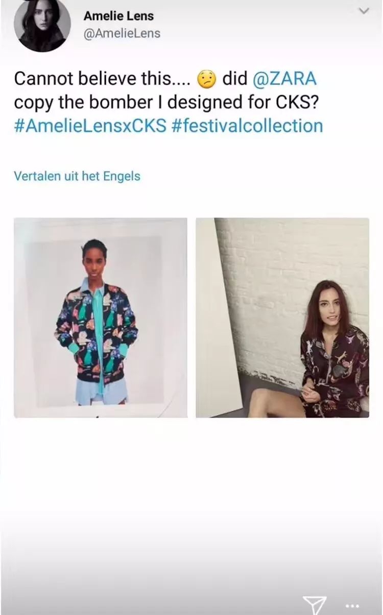 然而在这两天,Amelie Lens遇到了她根本不敢相信的事。她为CKS设计的“全猫”飞行夹克,被众所皆知的知名服装品牌ZARA抄袭了!这听起来实在是太不可思议,一位Techno艺人在服装设计领域竟被如此直接地“跨界”侵权。