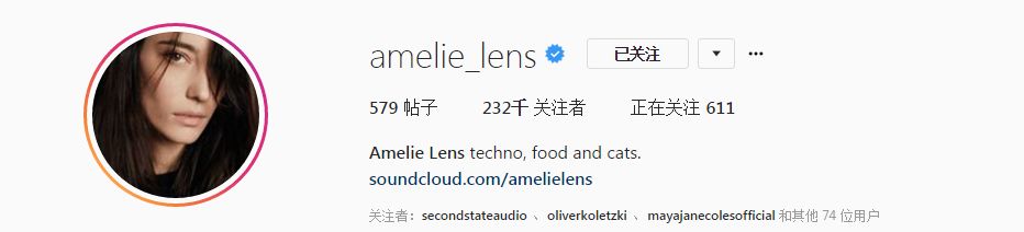 目前为止,Amelie Lens在Facebook拥有40多万粉丝,Instagram拥有20多万粉丝,Soundcloud拥有7万多粉丝,Youtube拥有4万多粉丝。而她对自己的简介则是一针见血、言简意核。Techno音乐,食物,以及猫。