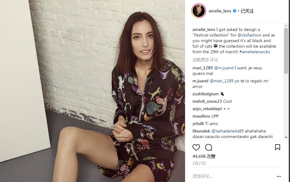 作为多才多艺的艺人,Amelie Lens在2月27日宣布,她为比利时时尚品牌CKS设计了一款“全猫”的服装,这款服装将由CKS在3月29日上市。超高人气的Amelie Lens的这条动态在Instagram上取得了4万多次点赞,被她的粉丝持续关注着。