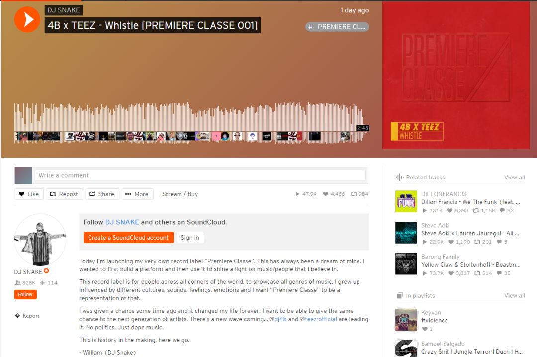 昨天,DJ Snake的厂牌Premiere Classe正式宣布成立。不过DJ Snake还没有给自己的厂牌Premiere Classe开设Soundcloud账号。DJ Snake选择在自己已经有足够大人气的个人账号下推出了厂牌诞生的消息,并且发布了Premiere Classe的第一首曲目。